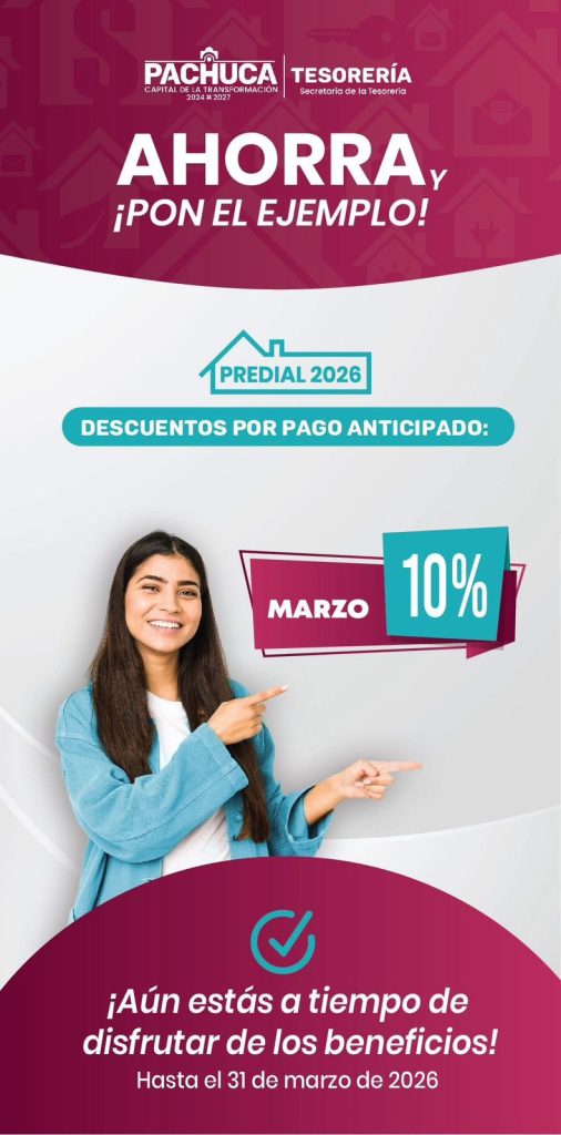 En Pachuca, como parte del cierre del periodo de pago anticipado del impuesto predial, mañana concluye el plazo para que las y los contribuyentes realicen este trámite con acceso a los descuentos vigentes, por lo que aún es posible aprovechar los beneficios disponibles a través de las distintas modalidades habilitadas.