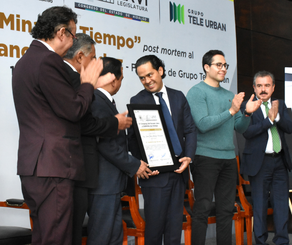 El presidente de la Junta de Gobierno del Congreso del Estado de Hidalgo, Andrés Velázquez Vázquez entregó la distinción “La Mina del Tiempo” post mortem al ingeniero Jaime Jesús Asturiano Hernández, fundador del Grupo Tele Urban, empresa que transformó el transporte público en un medio de comunicación de alto impacto.