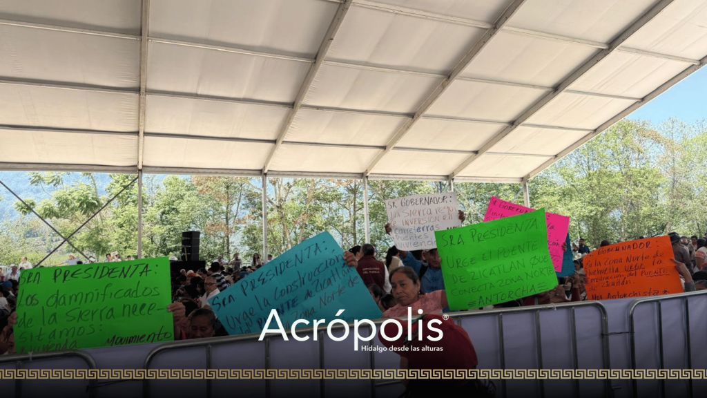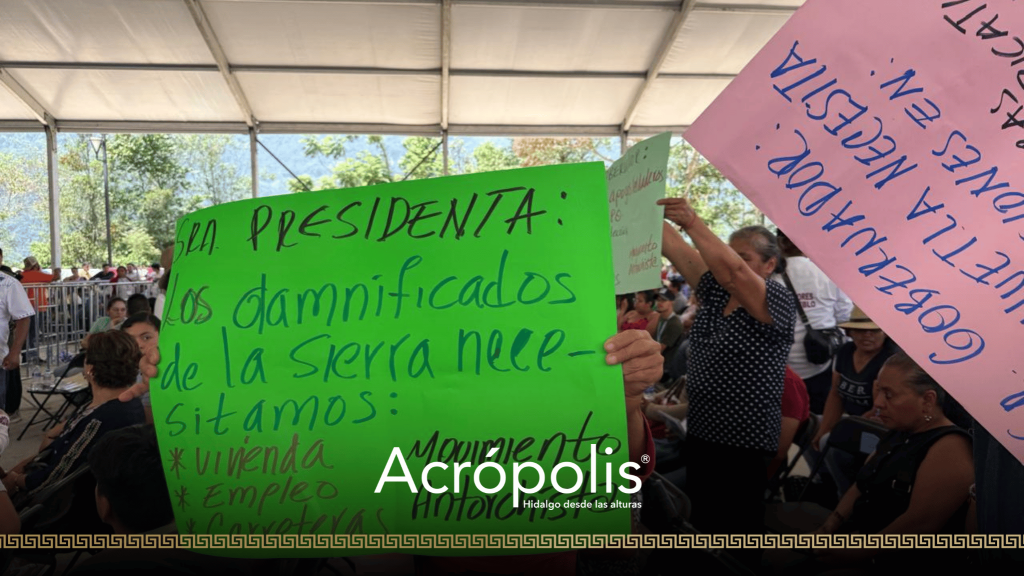 Durante la visita, en Tenango, de la presidenta Claudia Sheinbaum, habitantes de zonas afectadas el pasado octubre, se presentaron con lonas y cartulinas para demandar reconstrucción de caminos, carreteras y puentes; reubicación pronta de habitantes de zonas de riesgo; dragado de ríos y limpieza de áreas aledañas a zonas habitacionales; programas de vivienda, entre otras.
